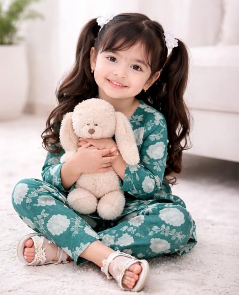 A cute and comfortable outfit for little girls, featuring a soft floral printed top with matching pants. Perfect for everyday wear, casual outings, and summer days.